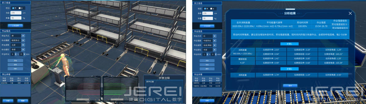 通過(guò)人工可達(dá)性分析,可以計(jì)算相應(yīng)的訂單完成率,人工工位疲勞度以及人工作業(yè)能耗分析等,幫助管理者合理安排任務(wù),合理規(guī)劃作業(yè)步驟。